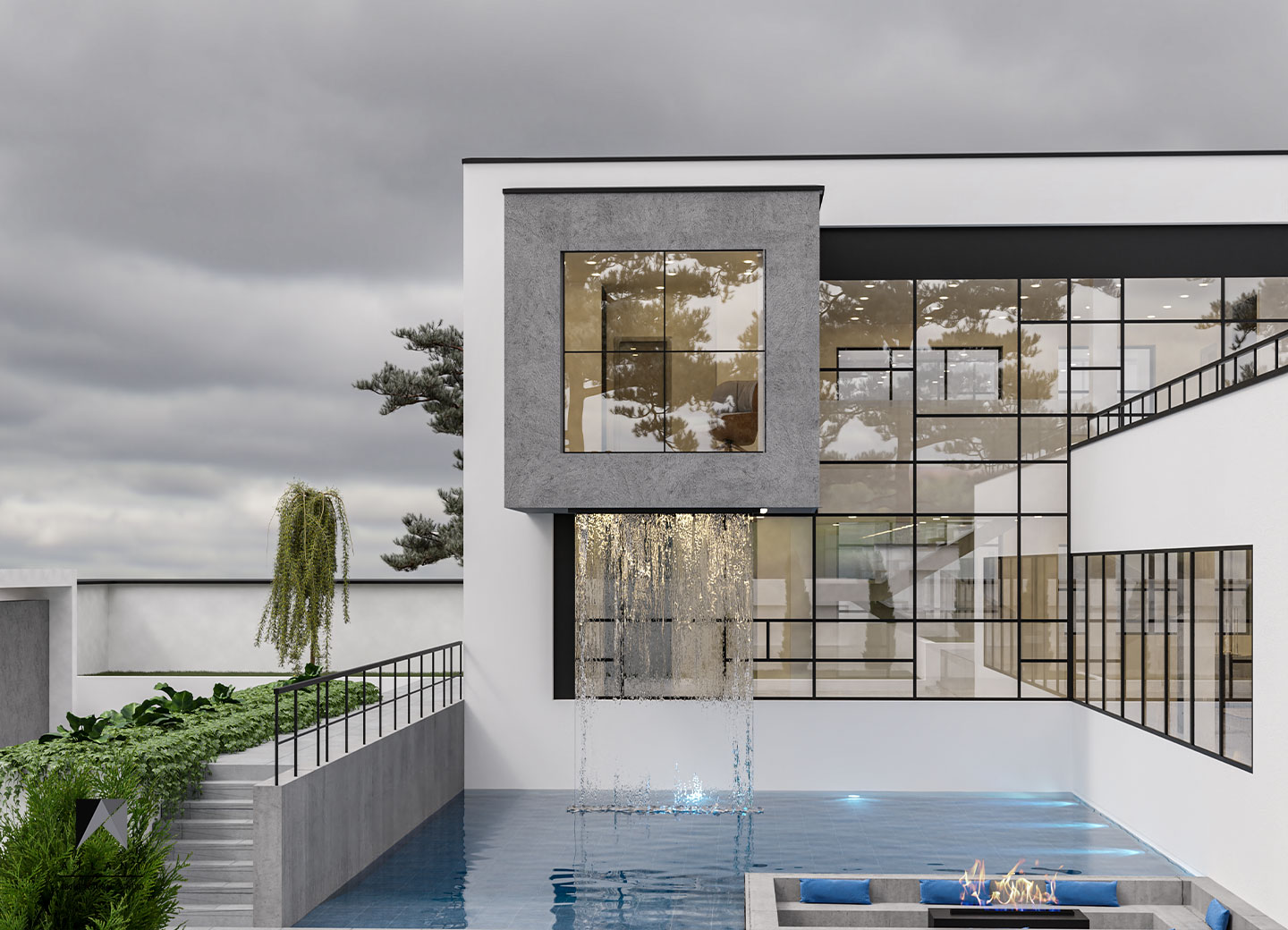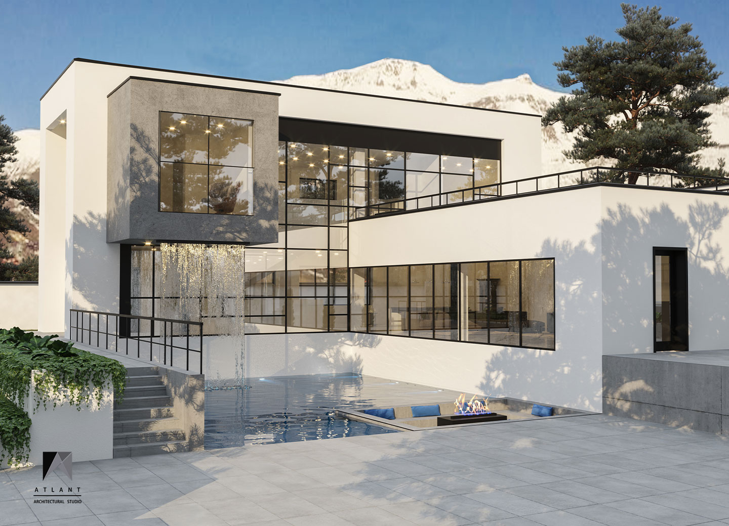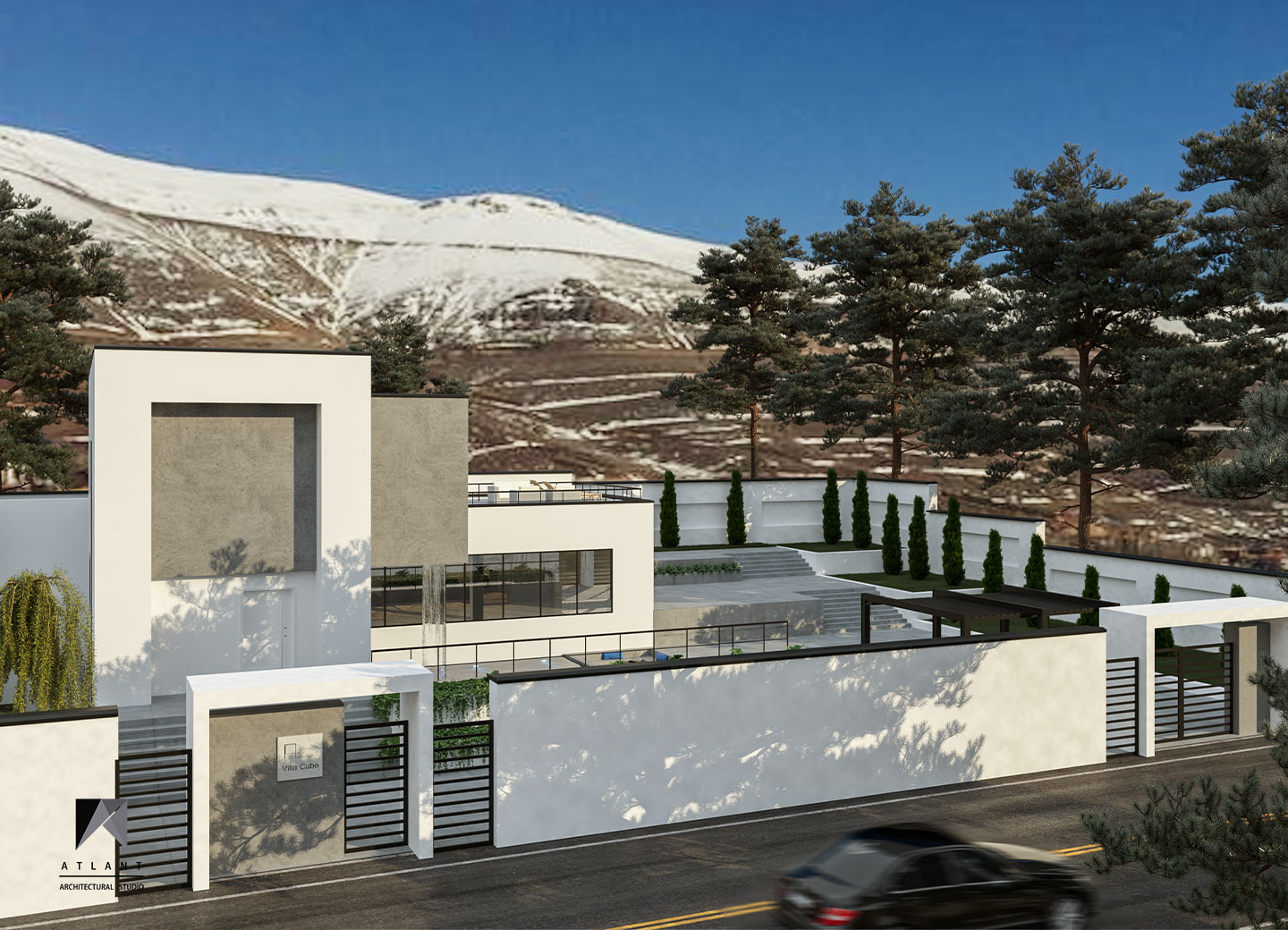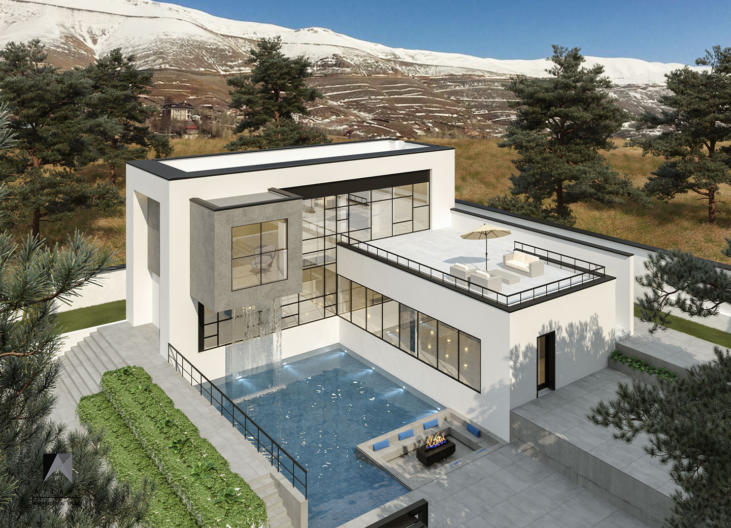 Villa Cube, designed on a relatively flat hillside of Damavand, consists of L-shaped physical forms that surround a fountain in the center, as an infill space. The one-story part features a green roof attached to the other part and a staircase provides access to the yard. Lots of transparent walls create a strong visual connection between the middle spaces including the waterfall and the pool. A suspended cube on the pool creates a visual appeal and a surreal atmosphere containing flowing water which is a point of the resemblance of a water-fall sound effect, luminosity, and fluidity inside and outside the building. The main Entrance locates across the larger part thus separating the villa entrance from the middle space to achieve more privacy.