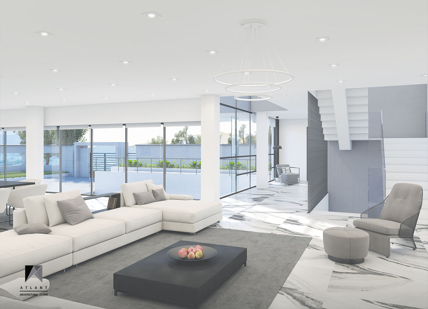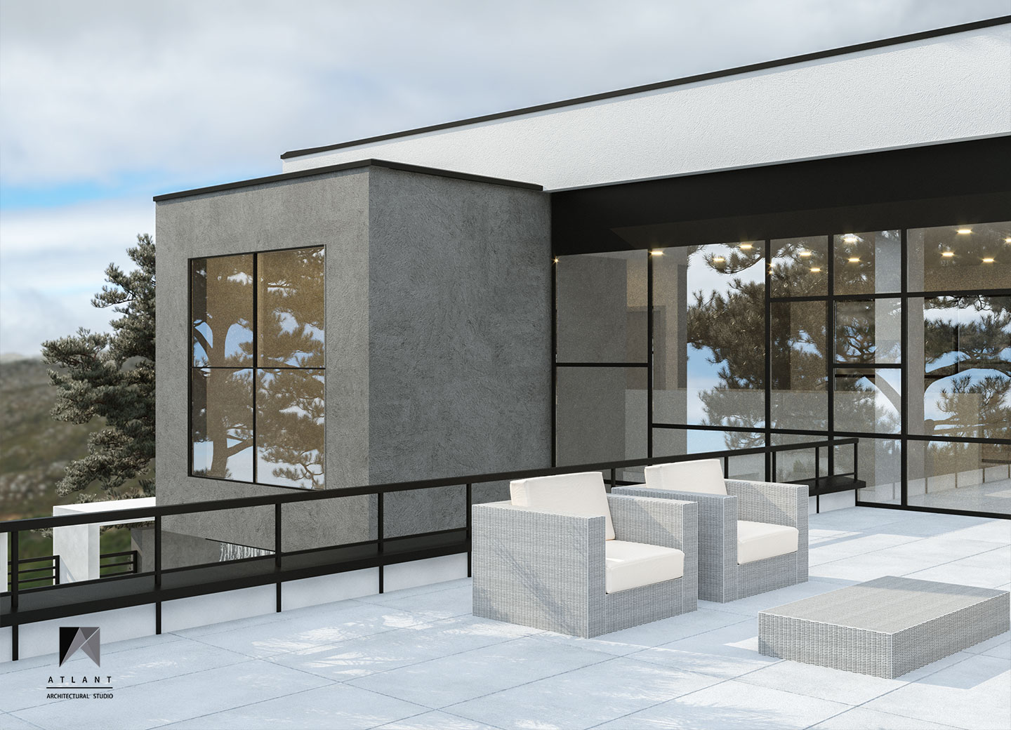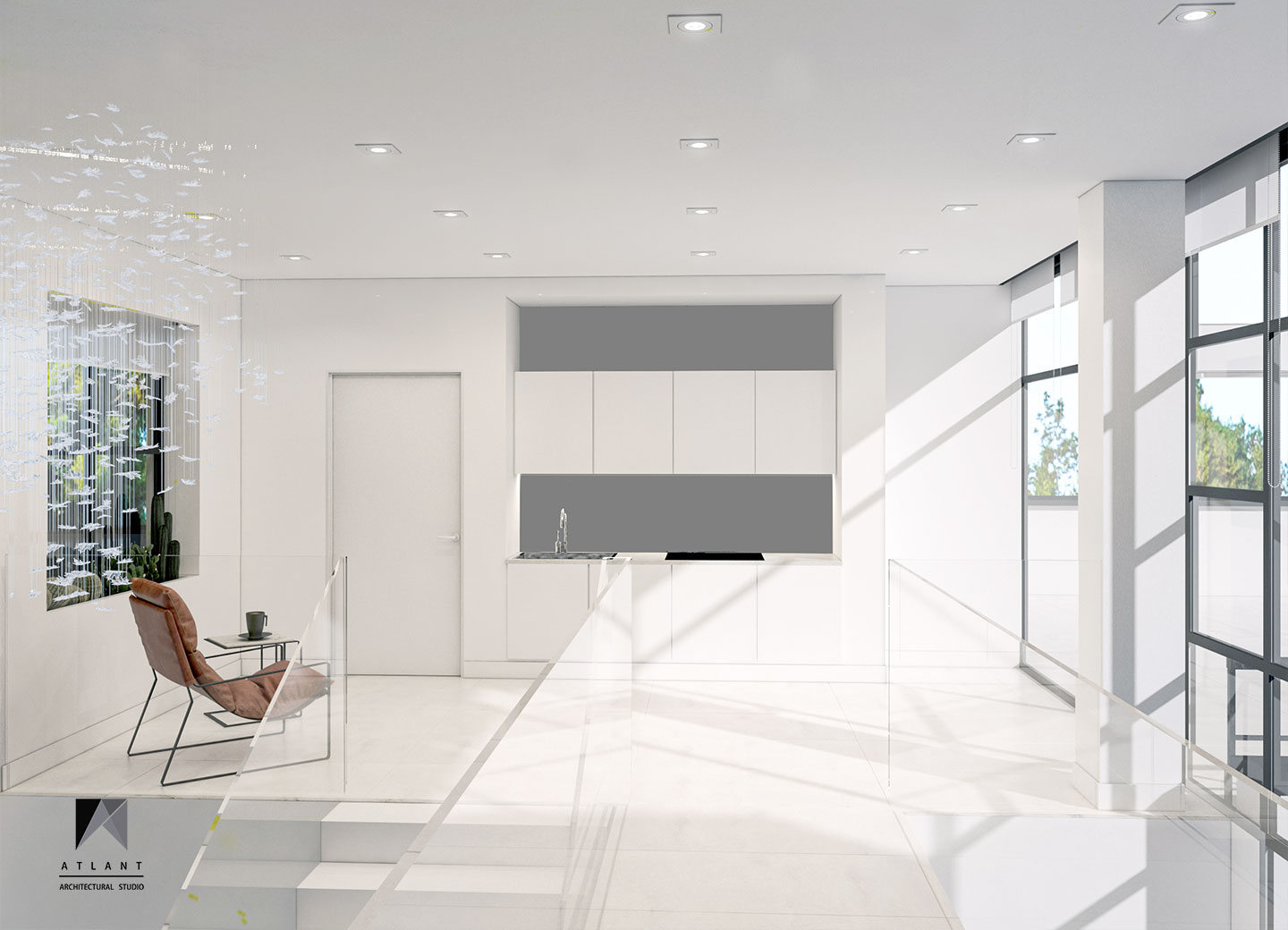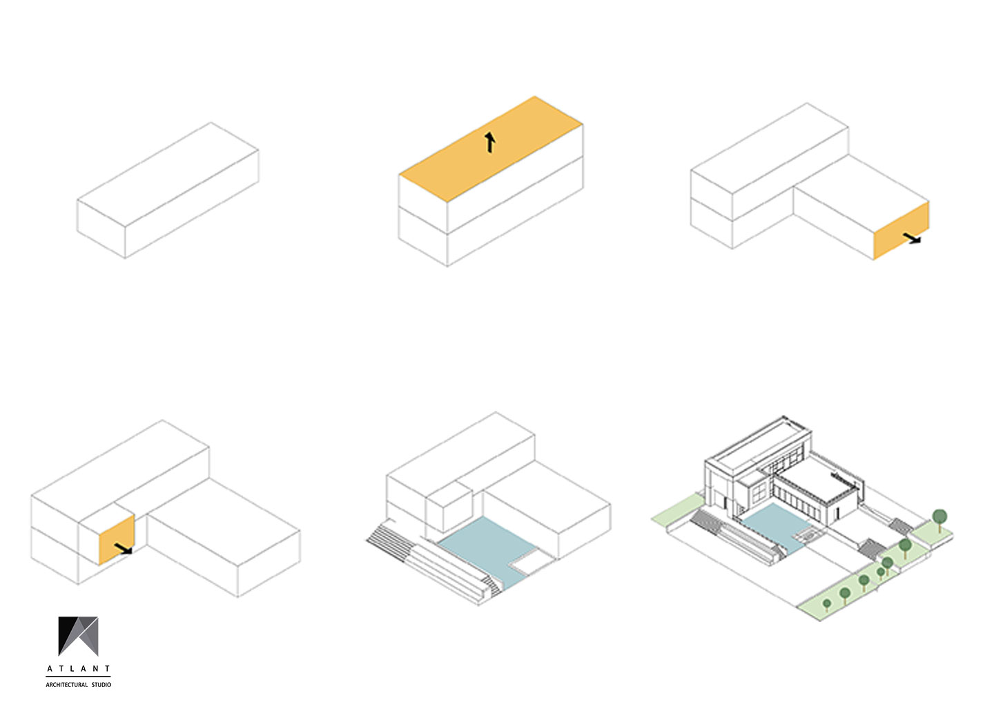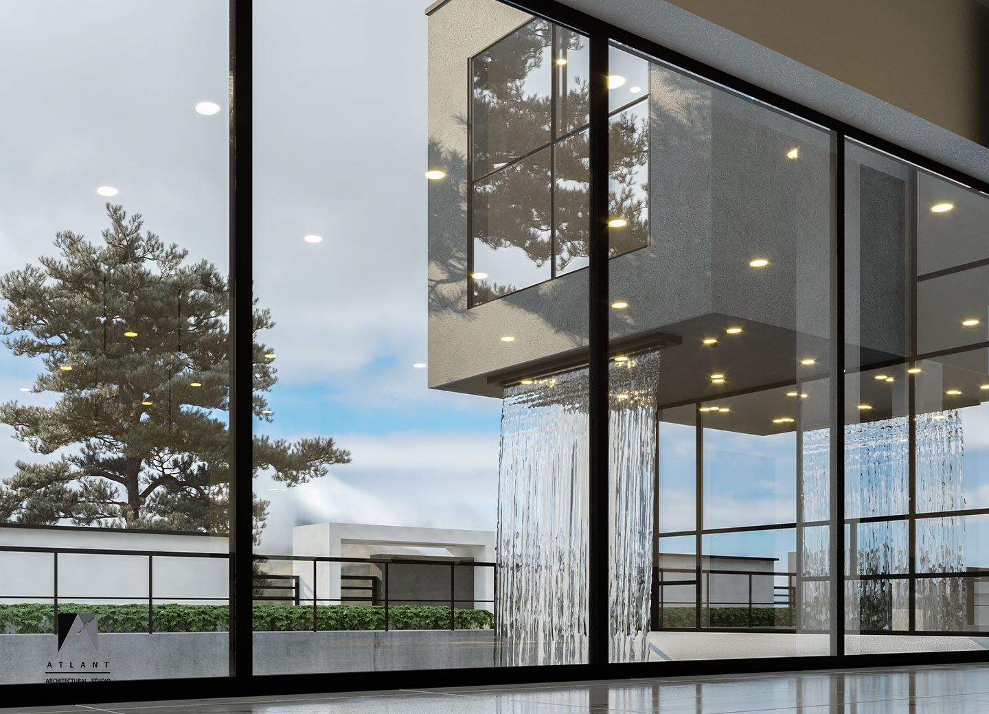 Villa Cube, designed on a relatively flat hillside of Damavand, consists of L-shaped physical forms that surround a fountain in the center, as an infill space. The one-story part features a green roof attached to the other part and a staircase provides access to the yard. Lots of transparent walls create a strong visual connection between the middle spaces including the waterfall and the pool. A suspended cube on the pool creates a visual appeal and a surreal atmosphere containing flowing water which is a point of the resemblance of a water-fall sound effect, luminosity, and fluidity inside and outside the building. The main Entrance locates across the larger part thus separating the villa entrance from the middle space to achieve more privacy.