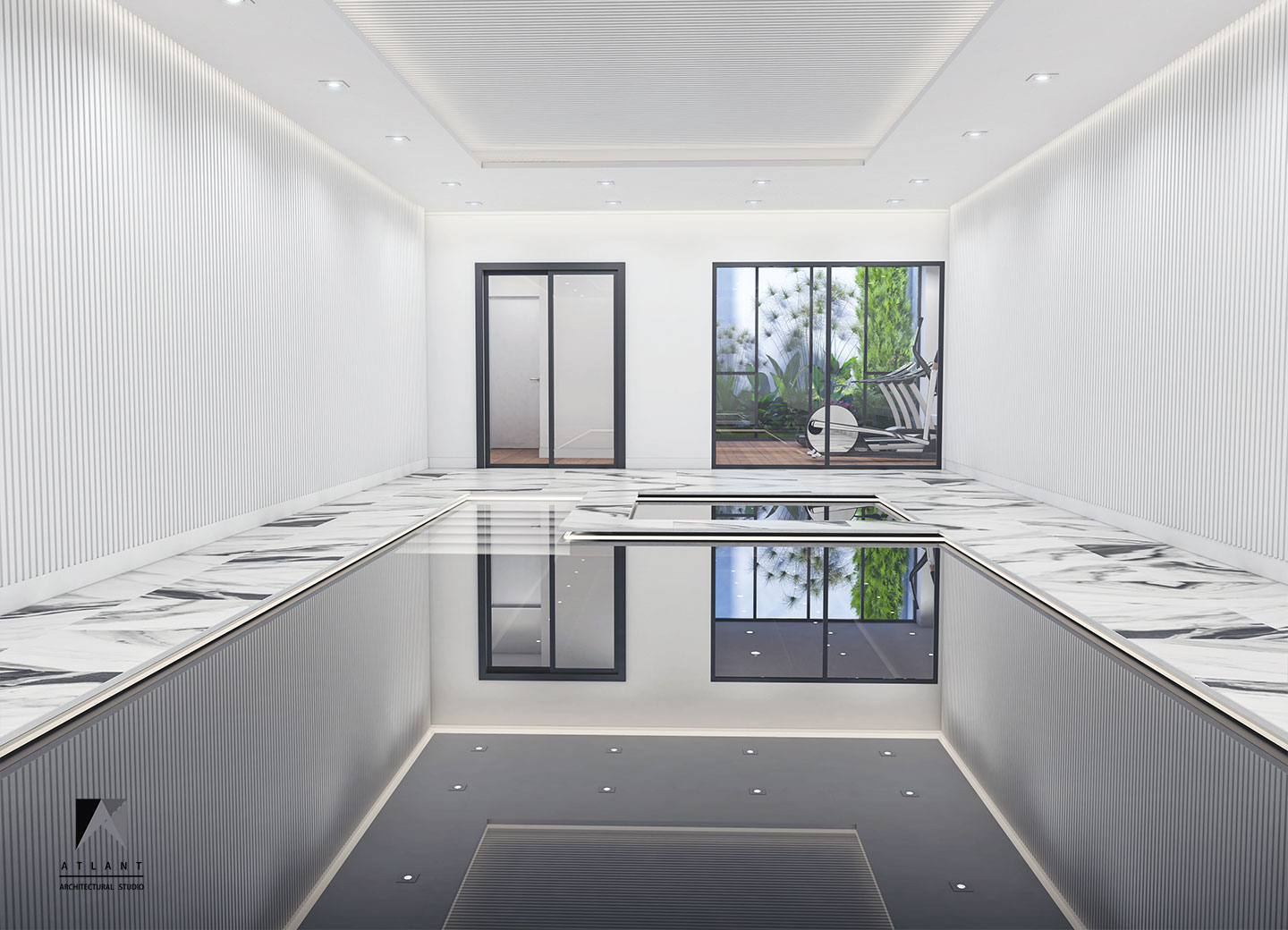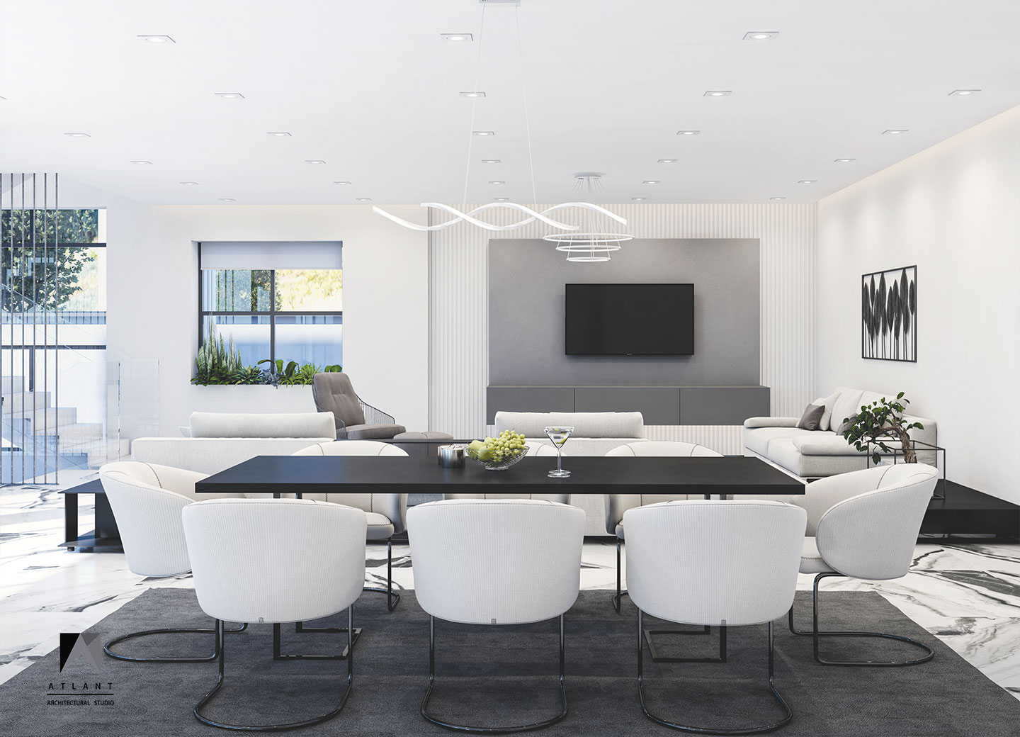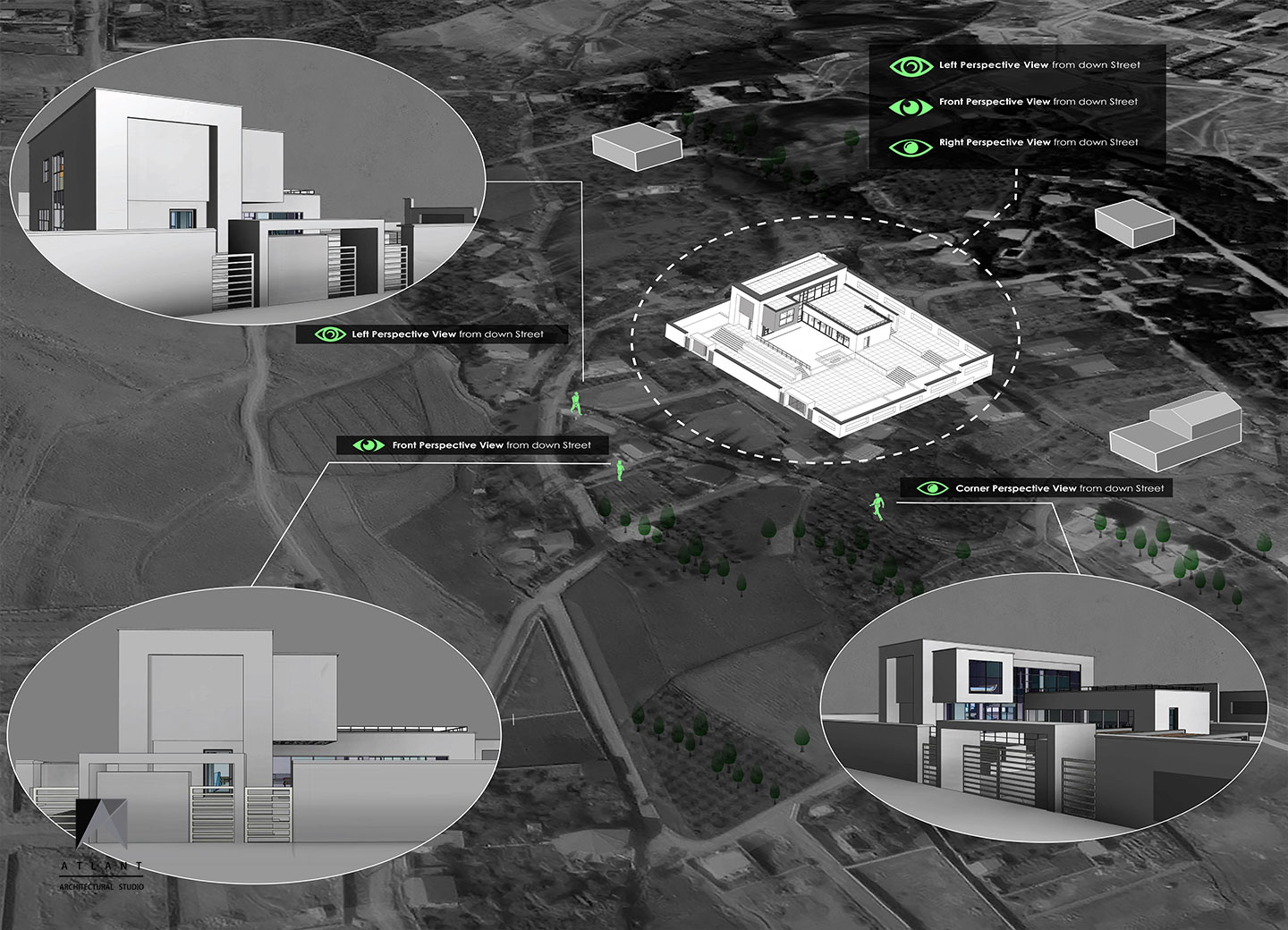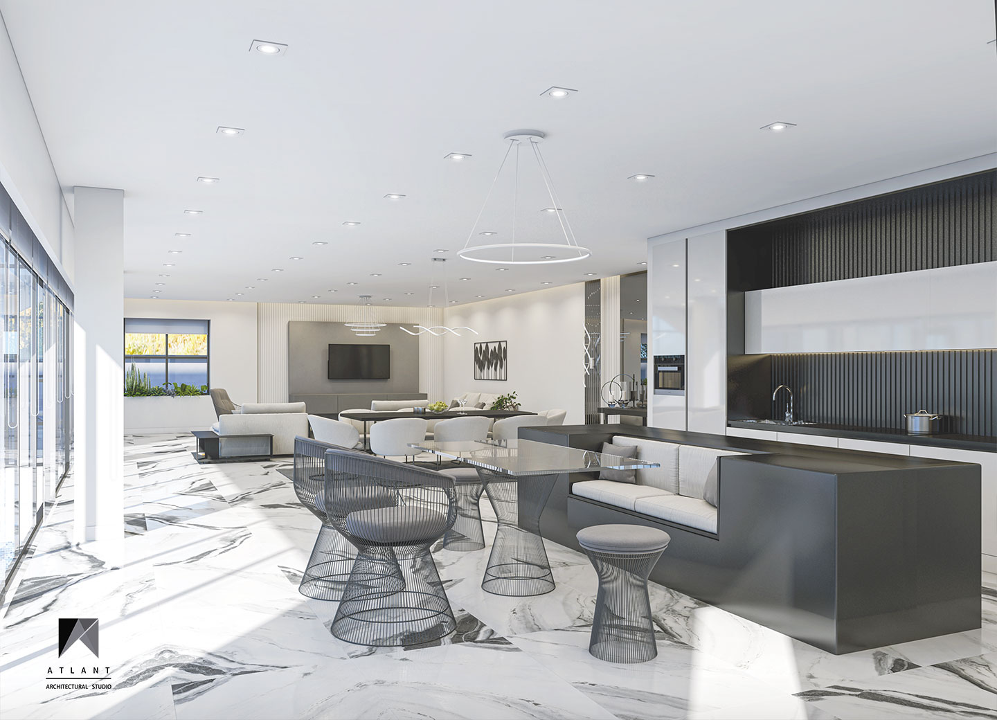 Villa Cube, designed on a relatively flat hillside of Damavand, consists of L-shaped physical forms that surround a fountain in the center, as an infill space. The one-story part features a green roof attached to the other part and a staircase provides access to the yard. Lots of transparent walls create a strong visual connection between the middle spaces including the waterfall and the pool. A suspended cube on the pool creates a visual appeal and a surreal atmosphere containing flowing water which is a point of the resemblance of a water-fall sound effect, luminosity, and fluidity inside and outside the building. The main Entrance locates across the larger part thus separating the villa entrance from the middle space to achieve more privacy.