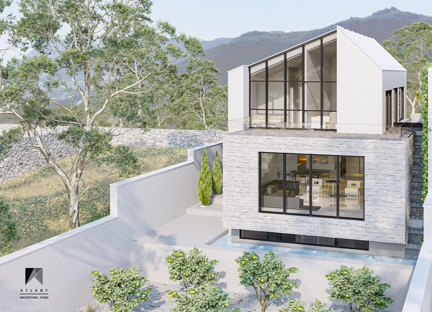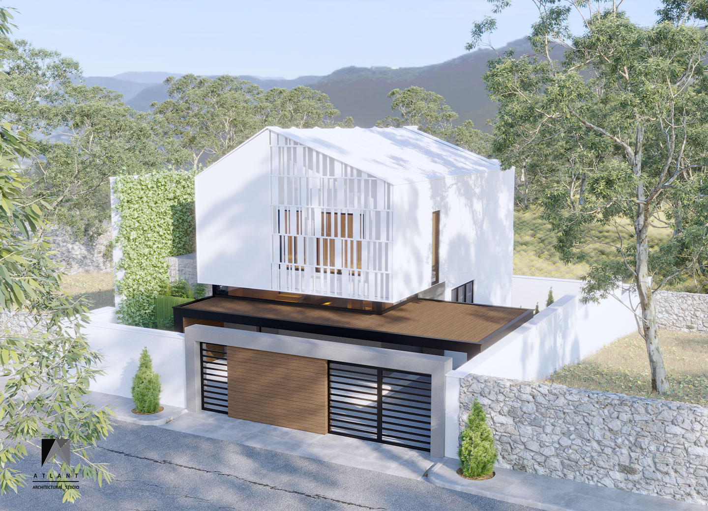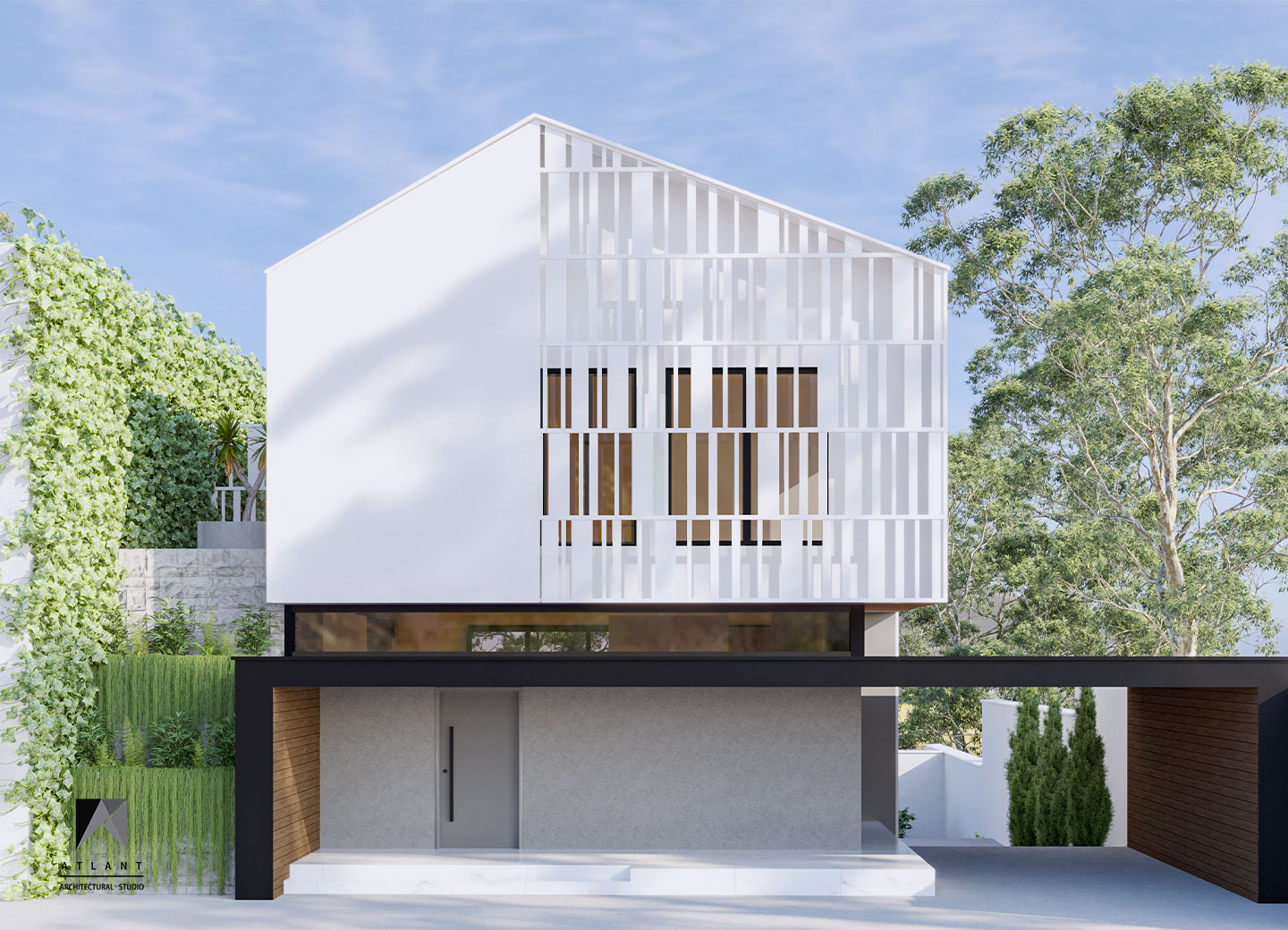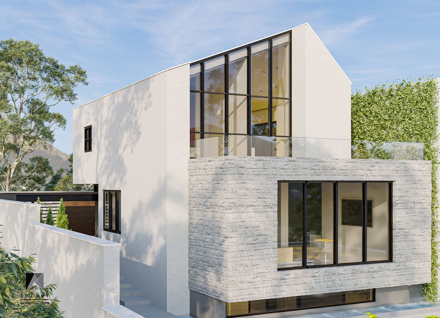 There is more emphasis on volume by separating the form of the upper floor form with a horizontal skylight under the anvil. The building was moved towards the eastern neighbor to make convenient access and the parking, which defines permanent privacy to the neighborhood with the green wall, in addition to creating an artificial landscape. To create a sense of freshness of the space on the south side, a suspended terrace and stepped waterfall was considered that doubles the tranquility with the audible beauty of the sound of water in this environment.