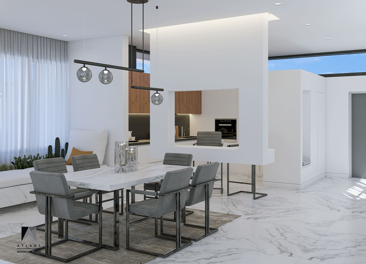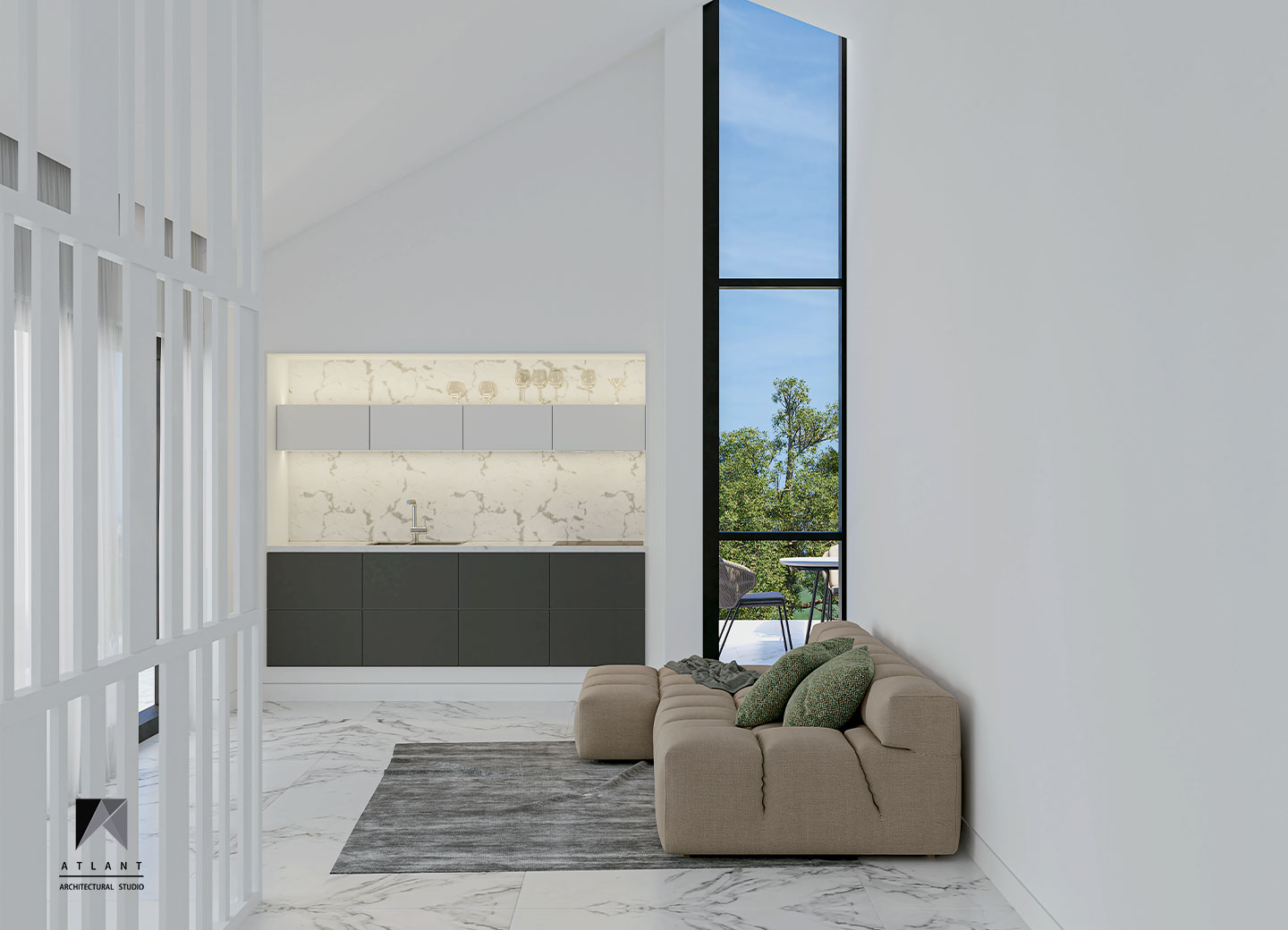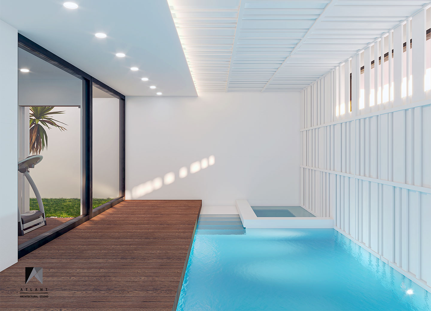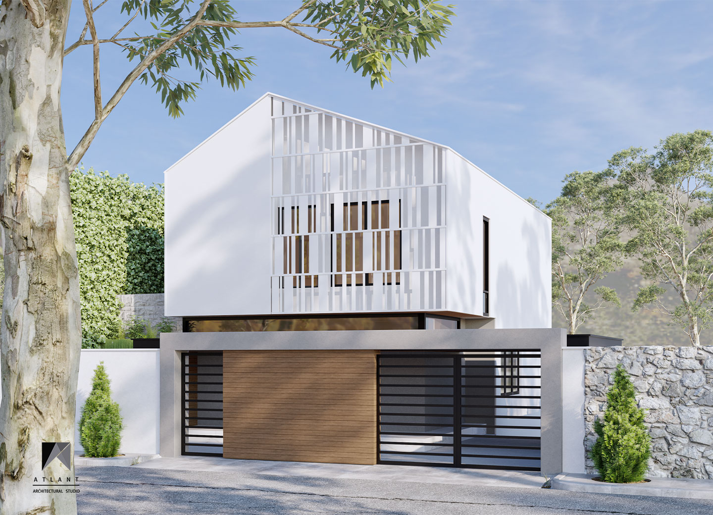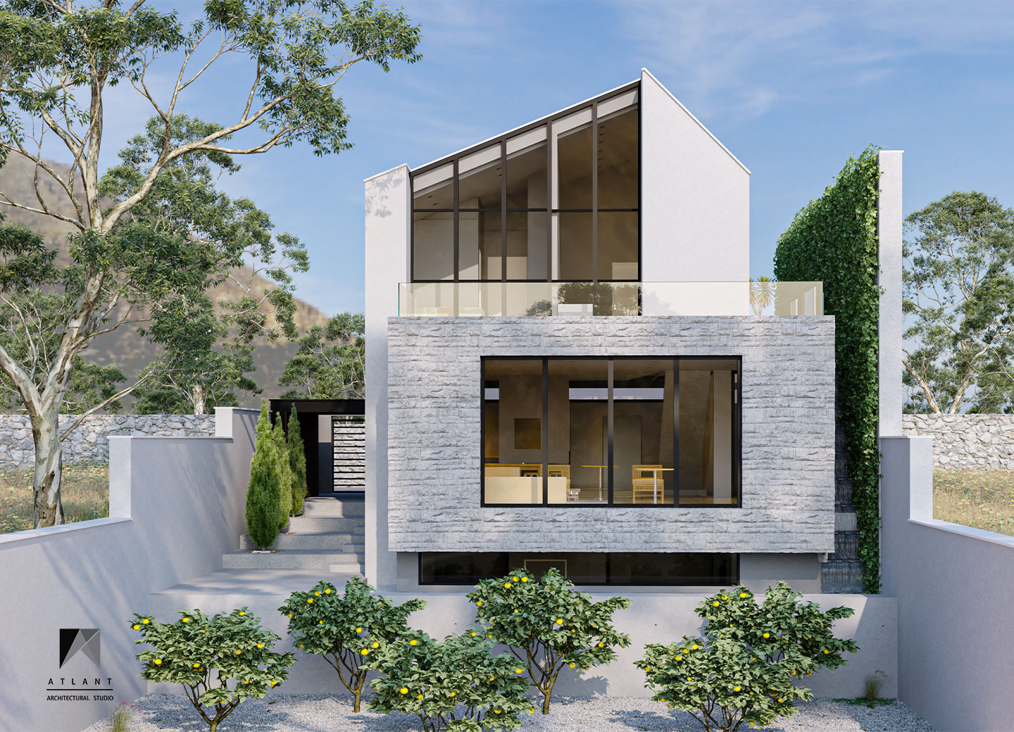 There is more emphasis on volume by separating the form of the upper floor form with a horizontal skylight under the anvil. The building was moved towards the eastern neighbor to make convenient access and the parking, which defines permanent privacy to the neighborhood with the green wall, in addition to creating an artificial landscape. To create a sense of freshness of the space on the south side, a suspended terrace and stepped waterfall was considered that doubles the tranquility with the audible beauty of the sound of water in this environment.